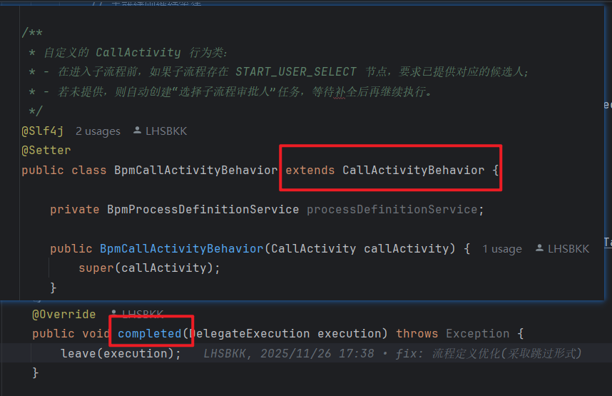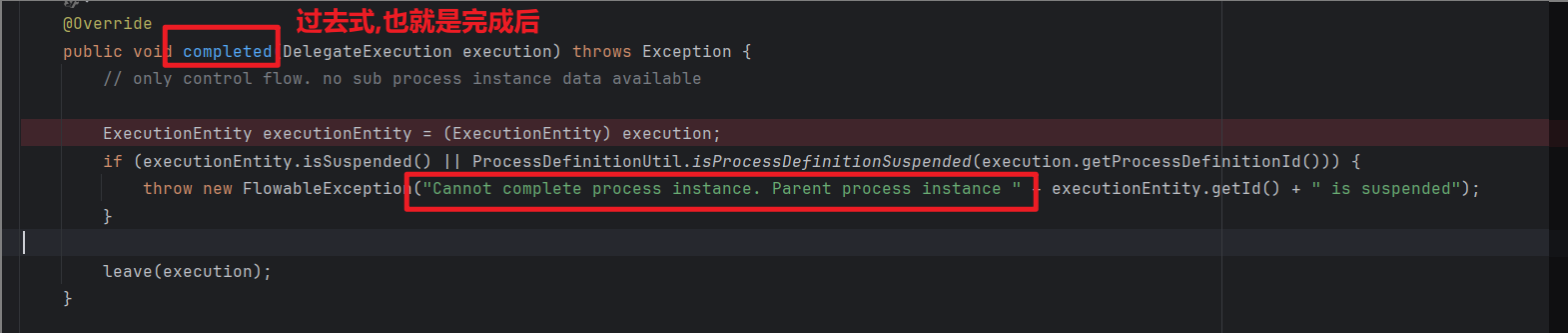 后续我才用了1的方式,只需要重写他的compted完成后方法,覆盖掉对结束后的流程定义挂起验证即可继承重写completed方法: