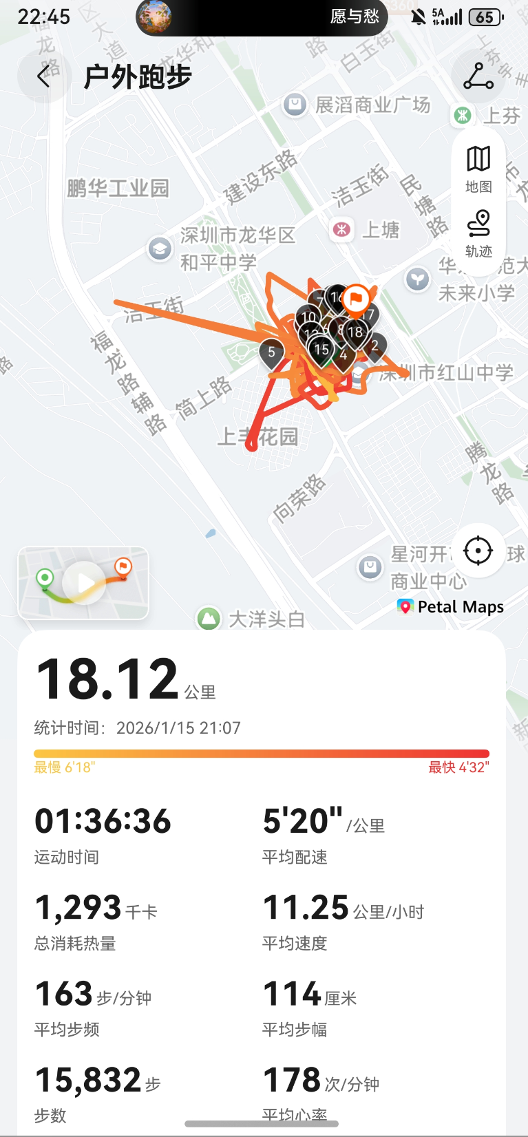 起跑后 相比于平时的步频限制 这次的步频恰到好处,我能贴合步频器的每一次回应 做到从从容容 游刃有余。前面的第一公里往往偏快,因为这个时候是状态最佳,且需要适应稳定配速的时候。从第三公里后 此时身体开始前面激活,也能开始调节速度的快慢。到达5公里时 往常我会关闭步频器,打开音乐做最后的冲刺。但是这次我选择继续跟随,只有保存住现在的节奏才有可能达到目标。来到9公里 看着一些同行&新加入的跑者 超越了我的速度,这时很想 跟随在他们后面(一般最后几圈跟随跑的快的人 感受他们的步频,速度,学习他们跑姿),虽然速度上受他们的影响 加快了一些,但是很快又调整了回来。 终于来到了10公里,现在感觉下肢变累了,热情也被脚步所磨灭。我知道就是现在了,打开了音乐播放器,心里的欲望再次响起。来到13公里此时跑道上已经没什么人了,有时候能在跑道上有人一起跑也是一件非常开心的事。这时候突然听见后面传来阵阵的脚步声,我想谁这么大架势(感觉应该是鞋比较硬,或者跑步姿势不对 踏步太用力了),声音越来越近,脚步声穿插在我的步频声中,当她超过我时,发现是一位女生,这个点跑步说明还是很有毅力的。脚步越来越沉了,这种情况超过她并保持速度并非易事,在下坡时她的速度明显优于我,于是我决定就跟 她的速度。几圈跑下来 已是15公里大关,距离我的最好成绩16 也只需要忍忍冲一公里便可拿下。状态有所回复 感慨还好是位女生,跑的才有动力,男生估计撑不到不到这里了。离18公里还有2公里多了,此刻 想起来一位体坛风云人物,一位坚持了二十五年的阿姨。在余年拿到了美国波马的冠军,留下了一句 Keep Showing up,[不是因为总赢而选择出现,而是只有始终站上赛场,才有机会赢] 。最后再冲一把,每一次的慢跑都需要一定时间的恢复,每一次的突破都需要不断的坚持以及再坚持, 一圈 两圈 三圈,拖着陷入泥泞般的双脚,最后我还是做到了!